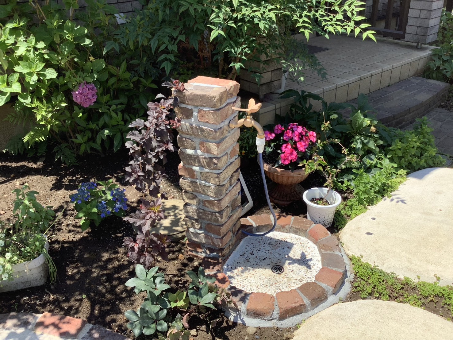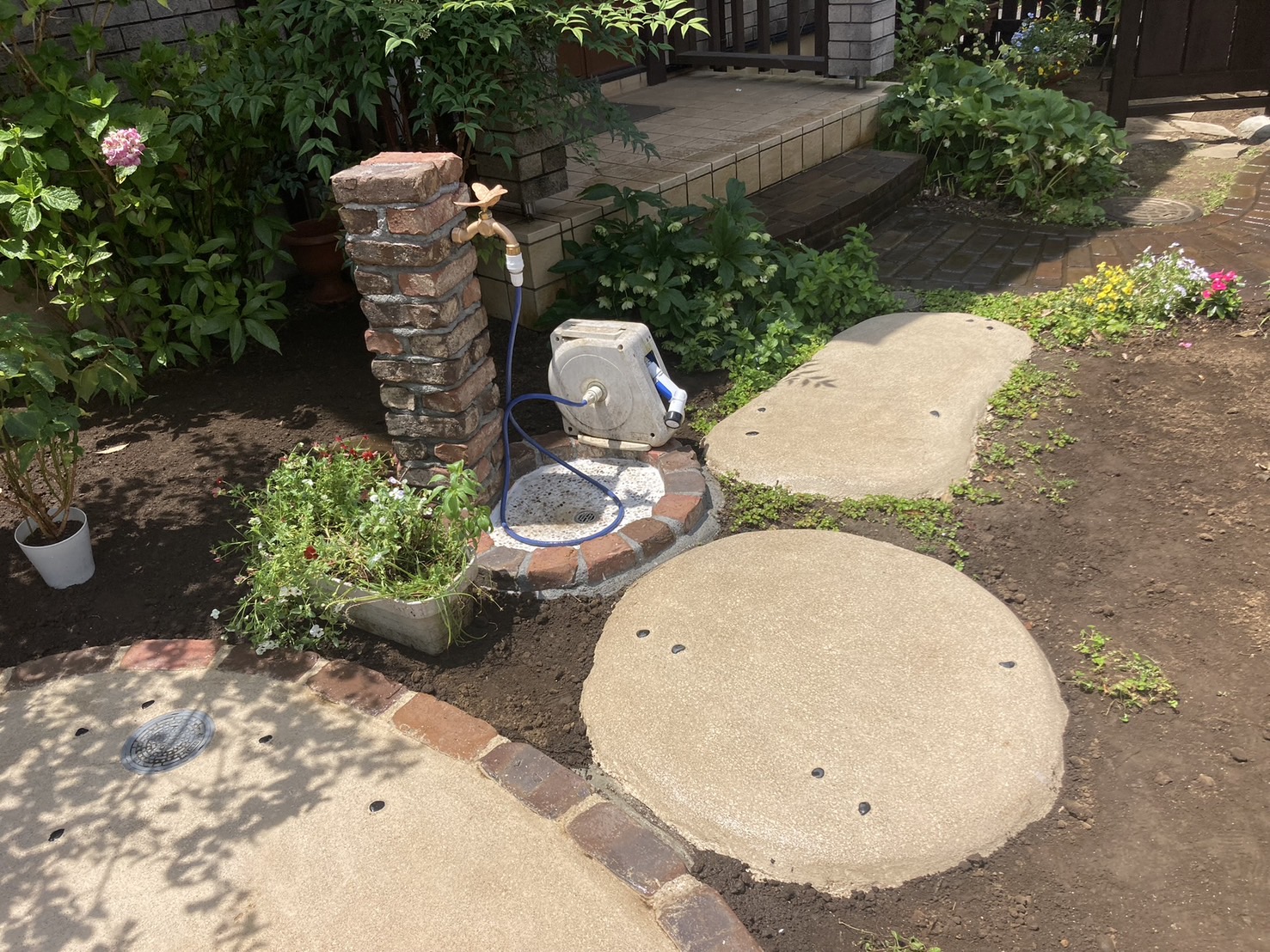 奥には結界がわりのトレリスを作り叩きのテラス、レンガの立ち水洗を制作致しました。