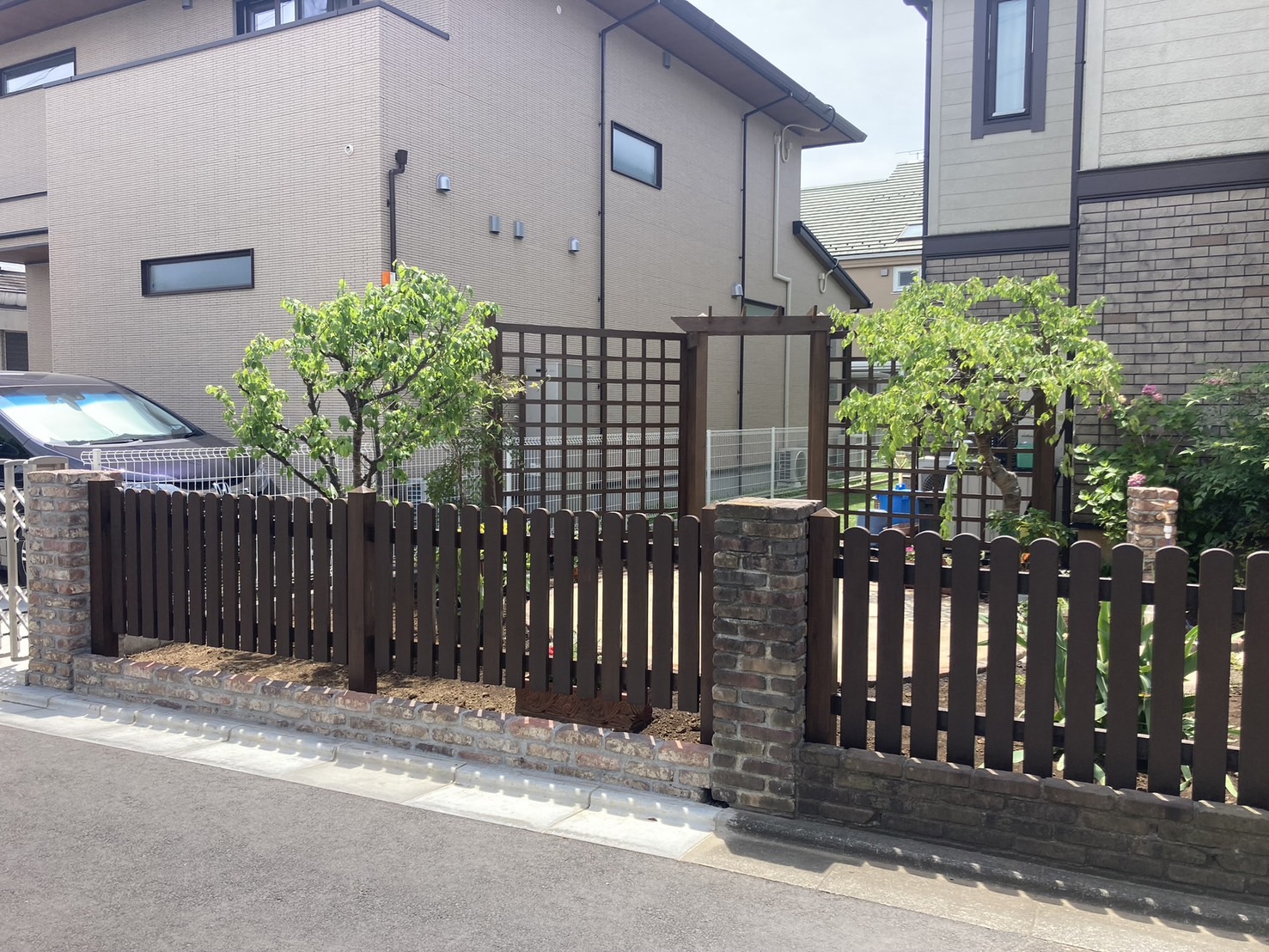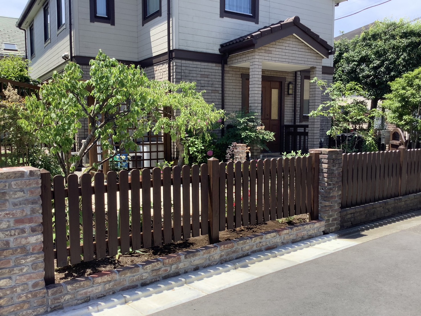 同じレンガが廃番で使えないので、似たレンガを探し、既存のフェンスの柱が痛んでいるので交換してフェンスはオイルステインを塗装し直し取り付けました。